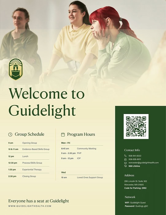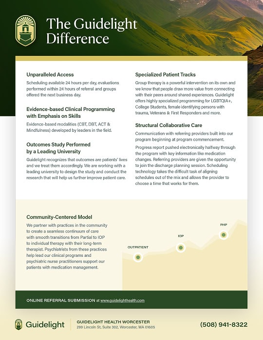 From brand discovery to launch, we partnered with Guidelight Health to build a thoughtful, purpose-driven presence. Our work included foundational brand strategy, visual identity, website design and development (from MVP to full-scale), print collateral, in-session materials, and environmental design—all crafted to support their mission of delivering compassionate care and clarity in recovery.